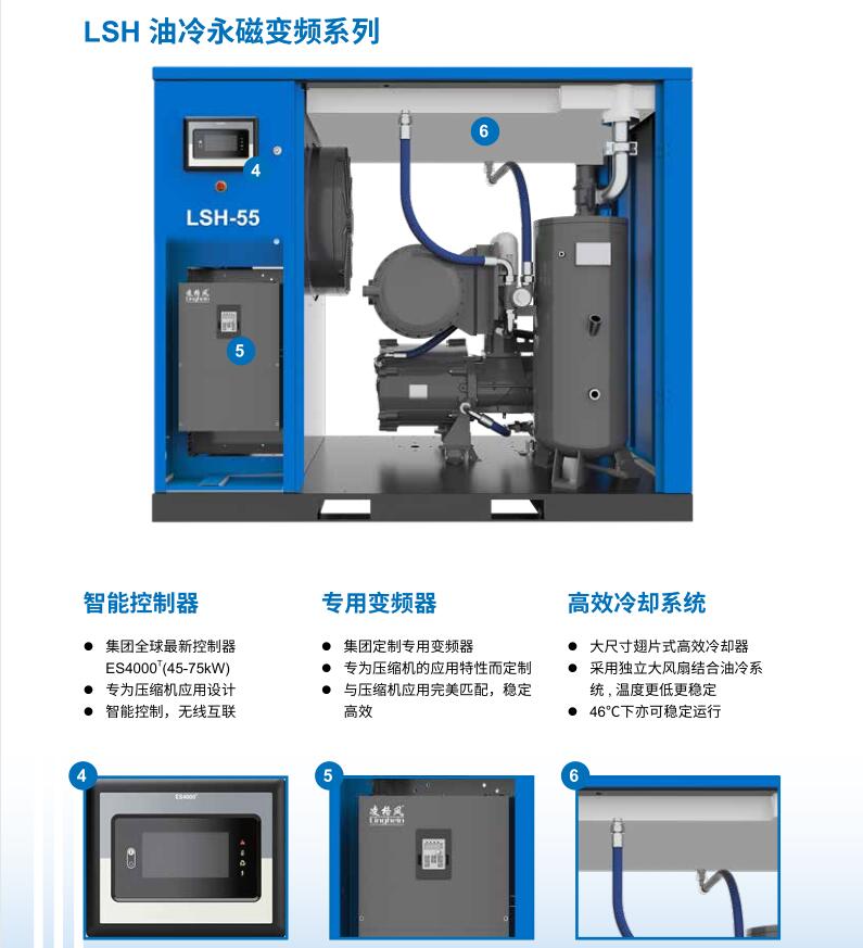 LSH 7.5-75系列油冷永磁變頻空壓機 凌格風L SH系列空氣壓縮機采用阿特拉斯科普柯新一代主機。耐久穩定,提供更高產氣效率、更少泄氣及更小壓力損失。可以精確地滿足用戶的空需求,且更加節能。
